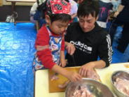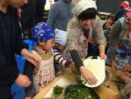 そして、お待ちかねのクッキングの時間。「これよく切れる!!」と予想以上に切れる包丁を子どもたちが使っていたことでお父さん、お母さんも驚かれたと思います。しっかりと包丁を握りながらも時々危なげに使ってしまう場面もあり、側で見ていてはらはらだったと思いますが,4月からのクッキングや餌きりの経験もあり、何とか包丁使いも形になってきている姿を見て頂けた気がします。すいとんもおにぎりも予想以上に子どもたちも喜んで食べていて「おかわり4回目!!」と言う子もいて食欲の良さに驚きました。野菜をこれだけたくさん子どもたちが食べられることに驚いている方もいらっしゃり、自分でつくったご飯のおいしさは本当に格別なんだろうなと感じました。