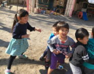 遊ぶ中で、残念ながら鬼に捕まってしまった子達がいましたが、残っているチームの仲間に「頑張れ!」「鬼が来てる!」と一生懸命、声援を送っていました。自分が捕まった悔しさよりも、残っている仲間を思う姿や自分のチームが勝ったときの駆け寄って喜ぶ子ども達の様子に、温かいものを感じると共に、集団遊びの良さを再確認しました。