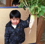先週のクッキングは豚汁を作りました。クッキングで使う野菜のうち、大根・白菜は畑のものを使いました。収穫に行くと立派に育った大根と両手で抱えるのがやっとの大きな白菜に気分の上がっている子ども達。