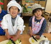 5歳児さんは、ネギを切る作業が初めてで、切っているうちに、少し粘り気が出る感触に、「うわぁ、ヌルヌルする」と感触を楽しんでいました。