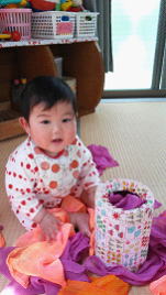 夢中になって引っぱり出していた所に「れなちゃ〜ん!」と声を掛けると満足そうな満面の笑みを見せてくれました。とにかく自分自身で何かが出来ることが楽しくて仕方がないようです。ひたすらいろいろ行動をしたりしてできることを試すのに夢中になるようなあそびをたくさん取り入れていきたいと思います。