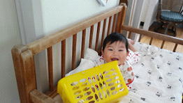 保育園の駐車場にこいのぼりが揚がり春風になびいています。2階の部屋はこいのぼりを見るのに特等席なんですよ。こいのぼりが泳ぐ度にじっと見つめたり、こいのぼりの歌をうたうと手足をバタバタと動かしたり「あぁ〜うぅ〜」と一緒にうたって楽しんでいます。