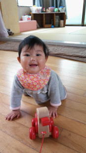 行動範囲が増々広がりハイハイで移動することがとっても楽しいれなちゃん。お部屋のドアを開けるとホールへ通じる廊下までハイハイで進めるようになってきました。アヒルの移動玩具を引っ張ってみせると動く様子をじっと見つめたり、捕まえようと手を伸ばしてハイハイで「まってまってぇ〜!」追いかけるのを楽しんでいました。