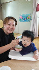 誕生会の後はクラスでお父さんお母さん方と一緒に離乳食を食べ普段の食事の様子も見て頂く事ができました。いつもよりお口をモグモグ動かしておいしそうに食べ、より一層おいしかったようで2人とも完食でした。大好きなお母さん方と一緒ずっと一緒に過ごすことができてとても幸せそうなりゅうしんくんとゆうせいくんでした。