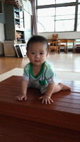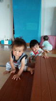 ホールに2段の階段を作り階段登りを楽しみました。私がハイハイしながら登り方を知らせると一番に嬉しそうに真似っこして寄ってきたれなちゃん。「こんなの簡単だよ!」とばかりにスイスイ登ってきました。上まで来ると「上手に登れたでしょ!」と満面の笑みを見せてくれました。そんなれなちゃんの様子を見ていたゆうせいくんも嬉しそうに寄ってきて登り始めました。