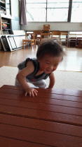 室内や園庭でも活発に動き回る子ども達は探索遊びに夢中です。りゅうしんくんに続き、れなちゃんも何も掴まらずに一人で数秒“たっち”する姿を見せてくれるようになりました。先日砂遊びをしている時、私の所へ来ようと立ち上がり「おいで〜」と誘うと“いっぽ…にほ…”と初めての一歩を保育園でも見せてくれました。毎日が嬉しい成長の日々です。