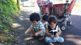 りゅうしんくんとれなちゃんはハイハイよりも一人歩きをする姿が多くなり、尻もちをつきながらも歩く楽しさを味わっており、散歩先で靴デビューしてみることにしました。初めて靴を履いた日は「これなぁに?」と違和感があったようで足元をじっと見たり、どうにか脱ごうとマジックテープを外してみたり…。ゆうせいくんはとうとう脱いでしまい、まだ靴デビューは早かったようです。
