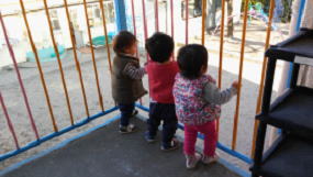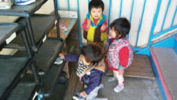 体調を崩しぎみな子ども達ですがお外へ出ると行動範囲も広がり、元気いっぱいです。散歩から帰ってくると、2階への階段上りも上手になり、登りきると得意げな表情で園庭にいるお友達やお友達が園庭にいないときは犬の“ももちゃん”に向かって「ヤッホー!」と声をかけるのがかわいい日課になっています。最近は自己主張も出てきて、階段上り時、私たちが補助しようとすると「イヤイヤ!じぶんでできるもん!」とばかりに手を振り払い、ハイハイや柵を伝って登っていきます。上まで行くと一生懸命に出来ないながらも靴を脱ぎ始め、手伝おうとすると「ジブンデ!」とやってみようとする子ども達です。