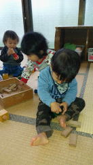 手元にじっと集中して上手に積み木をはめることが出来るようになったり、向きを変えて穴にはめようとする姿もみられていました。「すごいね!一人でできたね!」と声を掛けると嬉しそうに微笑む子ども達!「じょうず!じょうず!」と手を叩いて喜びを表現していました。