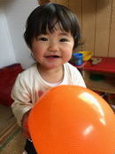 先週の午睡の時間・・・けいごくんがこっそり「今度風船であそぼうね」と小さな声で小さな約束。これは守らねば!!と早速今週、風船であそぶことにしました。朝、お母さんと離れがたかったけいごくんも、風船を見ると笑顔でバイバイできていました。朝の会の時も風船の袋を両手でしっかりと握りしめ、早速ふくらませると大喜び。