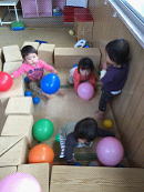 えいとくんも、こうせいくんも笑顔でハイハイで追いかけたり、顔をくっつけて遊んだりしていましたよ。その日は、1日中風船で遊ぶ中、午後から学童さんも一緒に遊ぶ時間がありました。そこで、学童さんが大型積み木で囲いを作り、その中に風船やボールをいれると子ども達は先週、同じような囲いにボールを入れてあそんだお風呂ごっこを思いだし、すぐに「ざぶーん!!」と飛び込みました。
