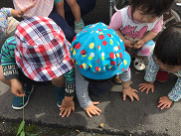 朝の会で歌ったかたつむりの歌を元気に歌いながら・・・といっても歌っているのはもっぱら私ですが。どこかにかたつむりはいないかな〜とブロック塀を覗いてみたり、草むらを探したり・・・。いましたいました、かたつむり。でも、中身は空っぽでした。けいごくんは、「かたつむり空っぽ・・・」と残念そう。