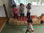踊りが大好きなりあちゃんも両手をぐるぐる回してみたり、こうせいくんも、近づいてきて身体を揺らして楽しんでいました。それからというもの、大型積み木を自分たちで並べて上にたって踊りだし、私に「歌って〜!」と催促することもあるほど。