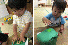 まだまだすぐに飽きてしまう子や、別な所に貼ってしまう子、裏返しになってしまう子など様々ですが、いろいろな素材や製作体験を通して感触を味わったり、造る楽しさを感じていけたらと思います。