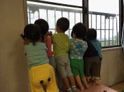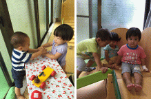 今月から全員がお弁当持参となりました。みんな揃って張り切ってお出かけしようと思っていると、外はどしゃ降り、激しい雷・・・ちょっと散歩は厳しいかなと、0歳児のお部屋に遊びに行きました。