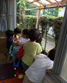 落ち着いたころに活動を始めていると、今度は積み込みが終わったトラックが運び出し作業でまた通ります。子どもたちはその音を聞きつけて再び走ってお見送り。こんな風に1日を過ごしているうちに、現場の方の休憩の時間に・・・。その話声が聞こえると、子どもたちはまたまた窓に駆けつけ、「何してるの?」「おやつもってきた?」「そのズボン濡れてるの?」など質問責め。まだうまく喋れない子も、「あー」「がっがー」と声をあげながら休憩している様子の見学をしていました。