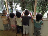 先日いつものように、朝の会をしていると・・・突然ガガガガガ〜と大きな音が鳴り始めました。子どもたちは朝の会などそっちのけで、一斉に窓際へ集合。踏み台を利用し、一生懸命背伸びして窓の外を見てみると、すぐそばを大きなトラックが「ピーピーピー」と音を鳴らしながらバックしてきました。子どもたちは、「おぉ〜」と声をあげ食い入るように眺めます。運転手の方は窓を開けたままゆっくりバックされていたので、子どもたちが並んで顔を出している様子に思わず笑ってらっしゃいました。「おじちゃん、がんばってね〜」とけいごくん。