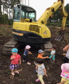 この日から毎日、子どもたちの日常の中に工事見学が入っています。朝夕裏庭に現場を見に行ってみたり、園庭で遊んでいてもトラックが通れば、砂場横のフェンスに張り付いてお見送り・・・。自然と、部屋においてある絵本の中でも工事車両が載っているものに反応するようになりました。
