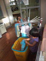 先日、私がいつものように外で子どもたちと遊んでいると、中にいる職員から「見て見て!!」と呼ばれました。なんだろうと思い行って見ると、そこには小さなお手伝いさんの姿が・・・写真のように通りかかったりのちゃんとももかちゃんが、おいてあった洗濯物を干し始めていたのです。その後は、げんきくん、りあちゃんんも干し始めていましたよ。
