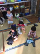 そして、「でた〜」と帰ってくると、座って自分でパンツやズボンをはこうとすることが増えました。両手で持ち上げて、足をあげ、ゆっくりゆっくり通していくのですが、なかなか難しく苦戦することも多いです。でも、手伝おうとすると、「○○が!!」と自分の名前を言って「自分で!!」とアピール。失敗してもくじけずに挑戦しています。そして、満足いくまで挑戦すると、「せんせー」と言って持ってきて一緒にしています。