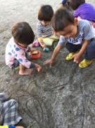 机の上で画用紙に描くのとはまた違った描画あそびとして、子どもたちはいろいろな表情を見せてくれます。機会がありましたらぜひ、ご家庭のお庭などでも一緒にされてみてください。