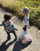 ビニール袋もあっという間にいっぱいになり、帰るときはけいごくんとともきくんが張り切って、「持つ!!」と言い、みんなで「ピッピッ わっしょい!」と大きな掛け声で進んでいきました。しかし、子どもの手には、芋は重たく、ズズズ・・・と引きずり、穴の開いた袋から芋がポロリ・・・またポロリ・・・振り向くと袋は空っぽでした。