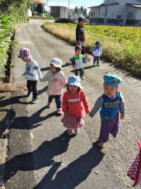 先週の金曜日は、お天気もよく風もなく、絶好のお散歩日和でした。みんなで歩いて近くのお芋畑へ出かけました。自然とお友達と手を繋ぎ、微笑ましい景色を見ながら進みます。