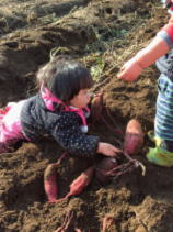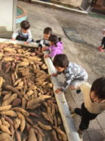 少しだけ顔を出したお芋たちを見ると、小さな手で一生懸命掘りはじめ、小さな手で小さなお芋を収穫すると満面の笑みで「せんせーみてー」と報告してくれました。ときには両手で持ちきれないほどの大きなおいもを収穫すると,よたよたしながらも必死にコンテナへと運ぶ子ども達。表情も真剣になってきて、だんだん無言になりつつ、次々に運んでいましたよ。おやつに出る焼き芋は大好きで、「おかわり〜!!」と言ってたくさん食べてくれます。