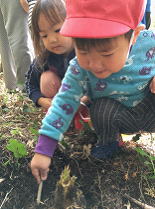 「たけのこだね〜」「いっぱいあるね〜」と子ども達も言っていました。たけのこの周りの土を側にあった棒で掘っているとらいのすけ君もじっと見ていて「ぅお!」と棒の要求をしてきました。持っていた棒を半分に折って渡すと一緒に土を掘り始めました。それに飽きてくると今度はたけのこをつつき始めていました。