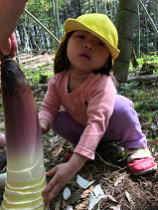 先週は以上児さんと山の持ち主の西さんの後をついてたけのこを採りに行ってきました。行きは下り坂なのでらく君やゆうと君は転がるように颯爽と駆けて行きました。以上児さんよりも先に先に行くので足が速い!と驚きました。山に入っていくと、子ども達の背丈ほどになったたけのこやそれよりも小さなもの、もっとじっくり探すとちょこんと頭を出したものがたくさん生えていました。