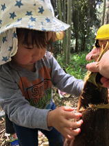 西さんや黒木先生が掘ったたけのこを見たり持ったりしてはると君やことねちゃんは「おっきいねー!」「重い…」など言ってました。私が「いっぱい服着てるねー」と言いながらたけのこの皮をむいていく側でことねちゃんとあんりちゃんが見ていました。