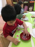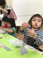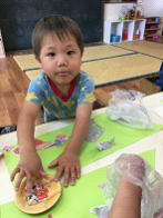 自分でやぶいた千代紙を鯉のぼりの体に貼っています。
