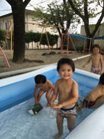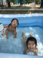 たまにひっくり返って自分でびっくりしていますがそれも面白く感じるようでその場にいるそれを共感できる子とケラケラ笑っていて楽しそうです。けがなどしないよう、十分注意しながら暑い日のプール遊びを楽しみたいです。