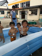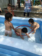 初めはペットボトルのふたに穴をあけてストローを通して水鉄砲にしたり、紙のカップに穴をあけてシャワーを掛け合ったり、少しの水の変化に親しんできた子どもたちにフープを提供するとその中をくぐり合いっこでお腹や肩も水につけられるようになりました。顔をつけてみようかと誘いましたが、初めは顔洗いごっこから、だんだんと水面に顔を付けられるようになってきました。まだまだ苦手な子もいますが少しずつ慣れてくれればと思います。