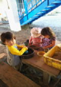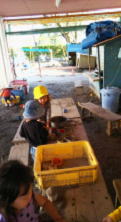 先日、子どもたちが砂遊びをしているところに耳を傾けてみたところ、道具をうまく使いこなしながら、砂を皿に入れて「かんながカレーライスをつくるからね、はると君食べてね」と持っていき食べる動作をする、はると君がいました。又せな君が「誕生日おめでとう」と唄いながら「今日は力也君が誕生日だからケーキを作ってきたよみんなで食べよう」と持ってきました。そのケーキを見るとイチョウの葉っぱでローソクがついていました。イメージを作りながらケーキに見立てながら遊ぶことができる子どもたちです又子ども同士での言葉のキャチボールができていることを思ったり、友だちといると楽しい、一緒に遊びたいという気持ちがあることに気づかされました。