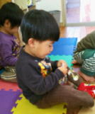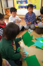 また,のりを上手にぬり「ぺったん、ぺったん」と大がかりな作業にも一生懸命な子ども達。集中力もついてきて,時間を忘れるほど友だち同士の会話も弾みながらどんどんと「はらぺこあおむし」の世界が出来上がってきていました。「あおむしさんはみんなが作った葉っぱたべるかな?」の声掛けにも,「食べるよ」と期待と自信に満ちた答えがすぐにかえってました。