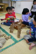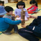 又かんなちゃん、はると君も自分なりに工夫しながらつみあげていました近くにいたせな君がつみきが足りなくなると友だちのものを黙って奪うのではなく「貸して」と言えるせな君が・・・ その言葉を聞いたはると君が「いいよ」と心よく貸してあげていました、それを見たかんなちゃんも「せな君、どうぞ」と貸していました。せな君は「貸してと言ったら貸してくれた」と感動を味わったことでしょう。 「友だちと関わる自分」「自分を受け入れる友だち」という友だち関係が自信につながってゆくことだと感じることでした。