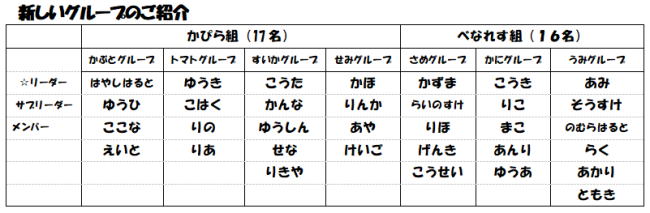 新入園児も加わったこともあり、グループの数もこれまでの6グループから7グループに増えています。新しいグループになり、気持ちも新たに子どもたちも活動に取り組んでいます。特に今回、サブリーダーに4歳児が新たに加わっているグループも多く、任される喜びが一人ひとりのさらなる成長につながっていけるようにサポートしていきたいと思います。朝の会が8時45分から始まります。この時間までの登園のご協力をよろしくお願いいたします。