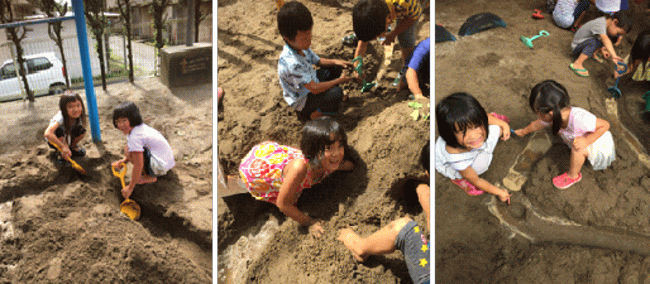 先日、砂場の全面を使って、山や川を造りました。子どもたちは、思い思いの道具を持ち出して、「ここに川をつくろう!」「こっちにお山!」「トンネルつなげよう」などと次々にアイディアを出しながら、自然と集まって力を合わせて取り組んでいました。