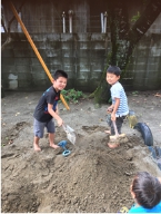 夢中になっていた自分の世界からふと視線をあげ、そこにいる大好きな友達に気づき、気持ちを共有する喜びを感じながら力を合わせ造り上げる達成感を感じ、汗をかきながらもきらきらした表情で遊んでいるこどもたち。子どもたちで造り上げた見事な山や川づくりは、次の日も続けて遊んでいました。遊びを通して子ども達の世界がひろがっていけたらと思います。