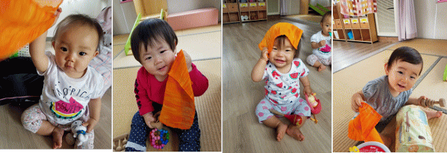 次に頭の上に布を乗せてあげると不思議顔の子ども達。初めは頭の上の布に手を伸ばし引っ張る事を楽しんでいましたが、次第に「ばー!」と言いながら布を引っ張る事を楽しみ始めたひなちゃん。なのはちゃんは頭に乗せた布から透けて見える私の姿に「フフフ♪」と笑みを浮かべます。布を引っ張る度に、小さな手で一生懸命布を頭に乗せようとするえみかちゃん。