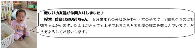 桜木 秋奈(あきな)ちゃん 5月生まれの笑顔のかわいい女の子です。3歳児クラスにお姉ちゃんがいます。あんよがとっても上手であちこちとお部屋の探索を楽しんでいます。どうぞよろしくお願いします。