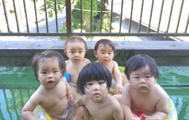 プール遊び・温水遊びも始まりベランダに温水を準備して温水遊びをすると「早く入りたい!」とベランダに急ぎ足で近づく子ども達です!沐浴大好きな子ども達はご想像通り水をパチャパチャしたり、容器で水を汲んで“ジャァー!”とこぼしたりとほっこり顔で温水遊びを大満喫し、夏ならではの遊びを楽しんでいます。今月は新しいお友達も増え増々にぎやかな夏になりそうです。暑さに負けずニコニコ笑顔で過ごしていきたいと思います。