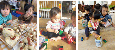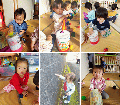 最近の子ども達のブームな遊びは指先を使ったあそびです。指先で小さいものをつかむことができるようになり、積み木や小さな物なども親指、人差し指、中指でつかめるようになってきました。握力もついてきて積み木を積み重ねることもできるようになってきます。空のミルク缶のふたをくりぬいた物に布やボール・ペットボトルキャップをつないだものを穴に繰り返し落として楽しんでいます。