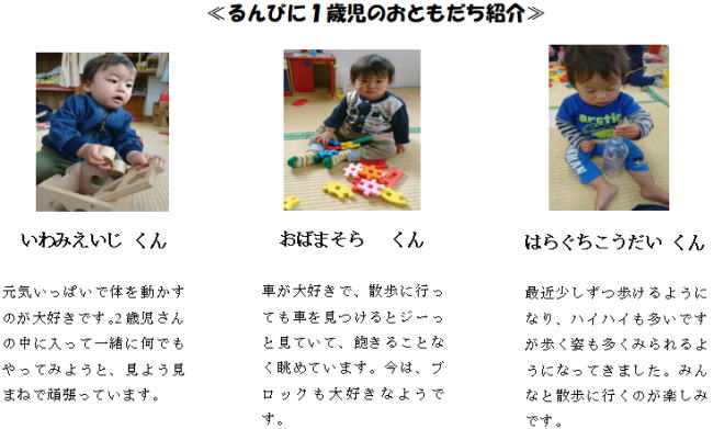 春の暖かい日差しを感じながら、新しい1年が始まりました。今年度るんびに1歳児の担任をさせて頂きます郷田ゆかりです。よろしくお願いします。