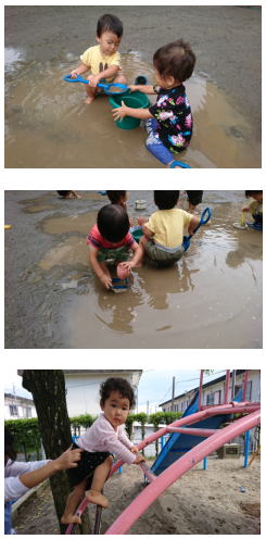 先日雨上がりのこと、バケツなどを取り出したえいじくん。何をするのかと見ていると、水たまりの水をバケツの中に入れています。なかなかたまりませんがせっせと入れ続け、それを見ていたこうだいくんも一緒になり入れ続け、ついにバケツはいっぱいになりました。そらくんもパトカーのおもちゃに水を入れていますがバランスが悪く、すぐ倒れてしまうのでこぼれないように片手でしっかりと持ちいっぱいにしていました。いろんな素材が子どもにとっては遊びの材料になりますね。