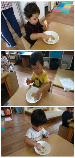 さらに豆(大豆)をもらうと、箱に1粒ずつ指でつかみ移していきますが、最初はつるんと逃げる豆をなかなかつかめなかったり、うまく箱に入らなかったりしていましたが、うまく移せるようになると、片手いっぱいに握り箱に入れたり、直接皿から箱に入れたりと、一人ひとりそれぞれ自分なりの遊びを楽しんでいました。しかし、床にコロコロとこぼれる豆もあります。それを見て、机の下、椅子の下の豆も1粒ずつ上手に掴み箱に入れていました。