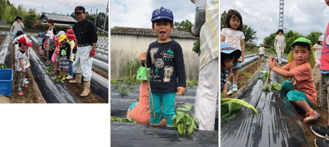 途中、既に苗植えが終わっている畑を目にし「ここも、芋畑だよ」と3歳児に話すと「葉っぱだよ」と見たままの感想が返ってきました。皆の頭の中には、それぞれのイメージが出来ているのだな〜といざ目にしたらどうだろうと子どもの言葉はワクワクさせてくれます。畑には、山田さんも快く手を貸して下さり子どもたちも真剣に話を聞いていざ始まりました。
