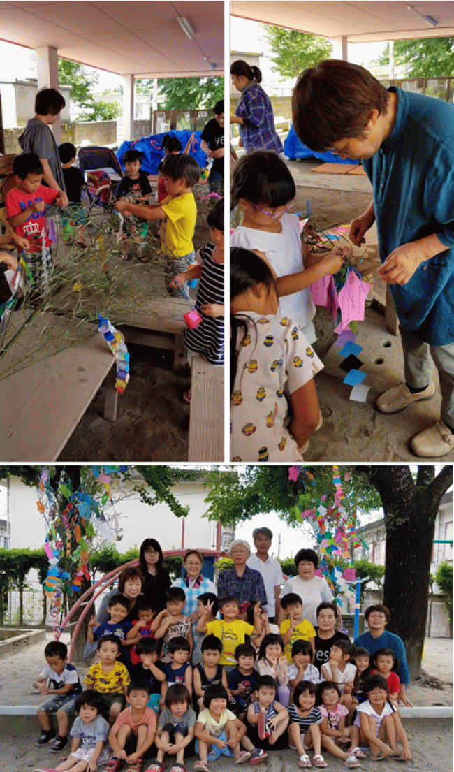 先日の2日におじいちゃん、おばあちゃん方と一緒に七夕飾り作りを行いました。おばあちゃん方の知恵をお借りしながら一緒に楽しみながら作っていきました。ツルややっこさんの折り方を知りたくて「どうやって折るの?」と真剣に尋ねながら作り進めていく姿もありましたよ。作った飾りを最後に皆で笹に飾りました、笹飾りを事務所前に飾ってありますのでぜひ子どもさんの願い事を探してみてくださいね。みんなのステキな願い事が届きますように☆彡