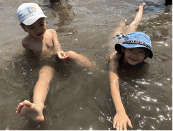 当日、その日だけ晴れるという奇跡にも恵まれ、子どもたちは下井海岸に向かいました。図鑑で見た魚を探したり、肩まで浸かって泳いだり、貝殻探しに没頭したり、青空の下でそれぞれの楽しみを見つけ、海を満喫していました。その後は、買い物に行き夕食づくりが始まり、バーベキューセットの組立てにも挑戦しましたが、ここで活躍したのが男の子たちでした。目を輝かせながら、自分たちで箱から道具を取り出し、写真を見ながら「これじゃない?」「こことここをくっつければ?」とネジを締め、見事完成したことに驚きでした。